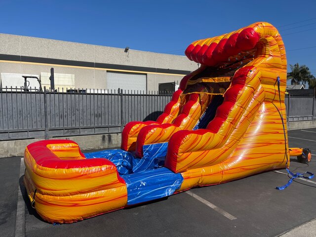 Our 14′ Volcano Lava themed water slide is great for all ages. This water slide is recommended for kids 5 years old and older to adults. Requires a water source/hose. It has a pool at the end. All rentals are 9 hours max per day.