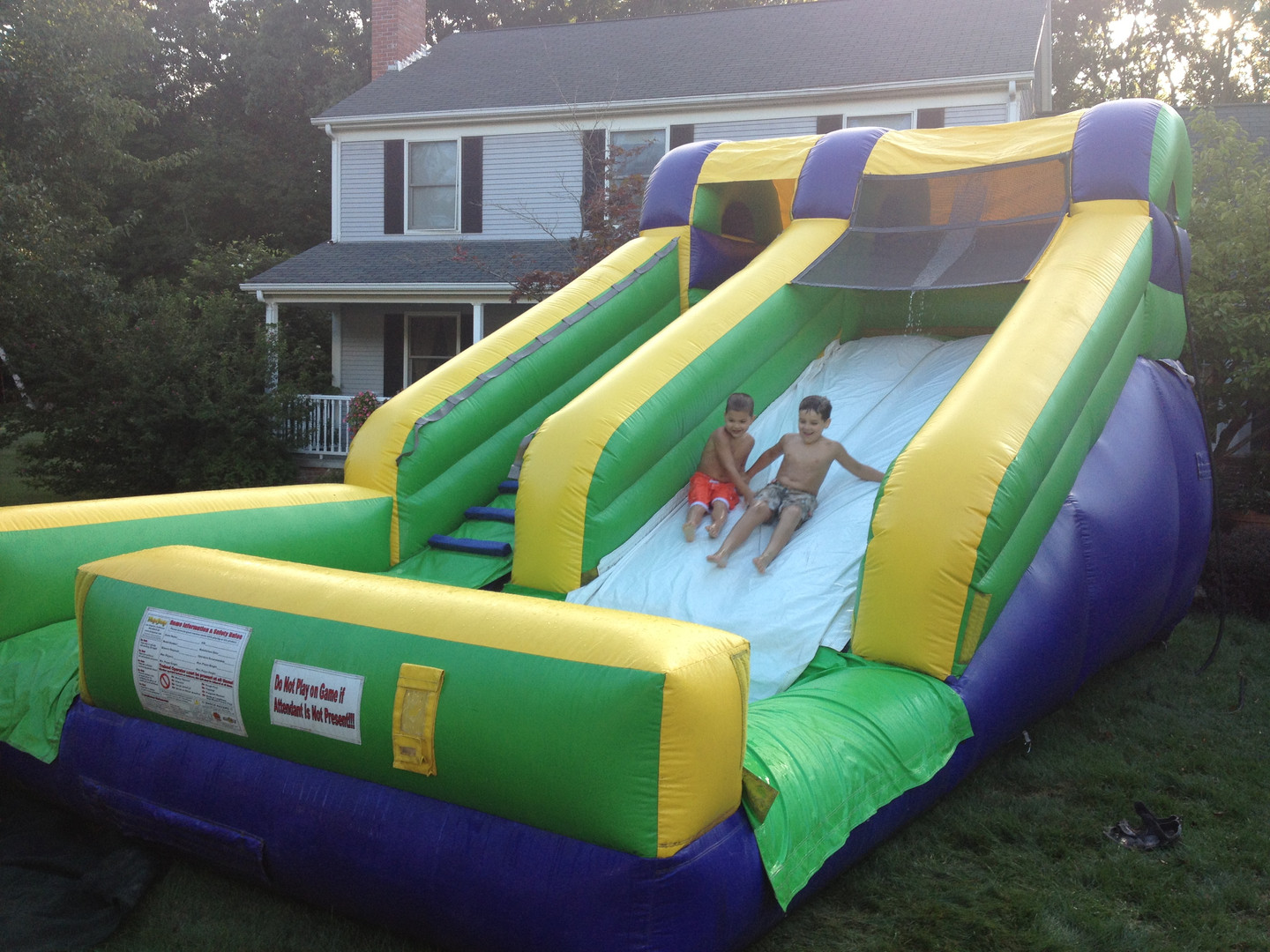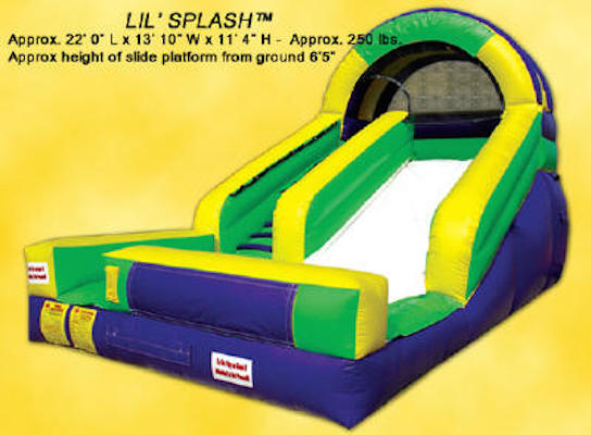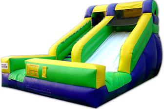 It has one climber and a one person slide. The slide is approximately 8 feet high and 12 feet long at a 40-50 degree angle. It has a pool at the end, which is approximately 4 feet wide, 4 feet long, and 1 foot deep. (Water system is provided; customer must have a water hose with a connection that reaches the set up area). ENTRANCE TO SETUP AREA MUST BE AT LEAST 3 1/2 FEET WIDE..